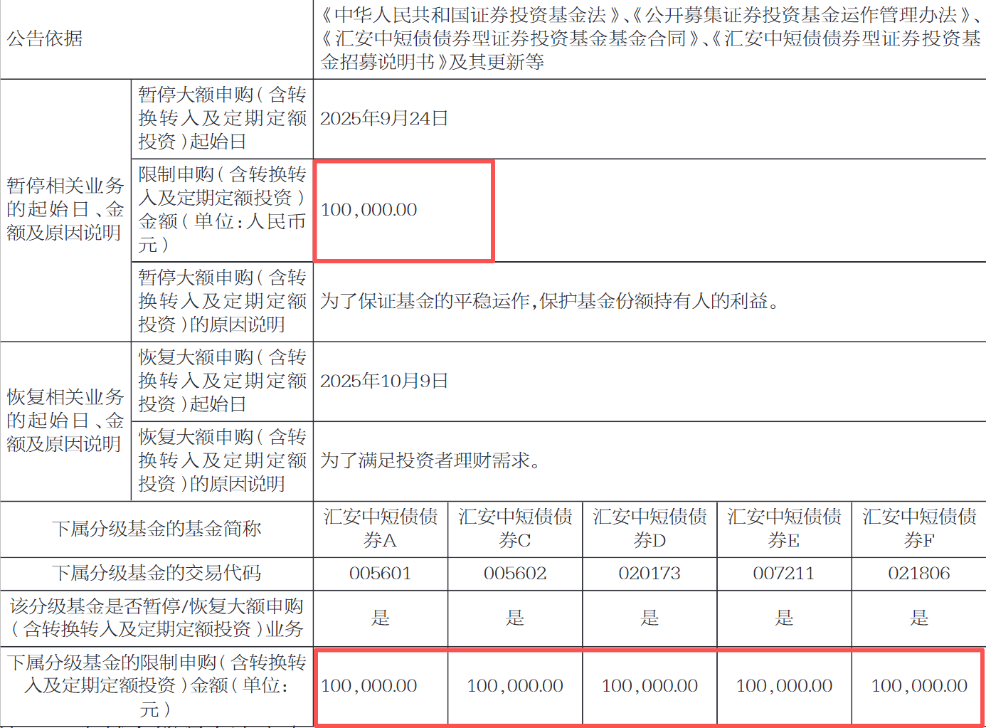 中短债基金已经启动限购。汇安基金公告称,汇安中短债债券自9月24日起对单个账户单日累计申购金额超过10万元的部分实施限购,直至10月9日恢复。湘财基金旗下湘财久盈中短债也自9月26日起限制申购,单日单个账户单笔金额不得超过1万元,至10月13日恢复。