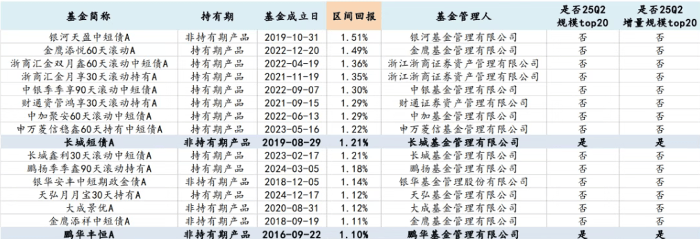 如果我们结合业绩端看,也不难发现业绩靠前的短债类产品,整体规模也并不小。其中有两只产品表现较为亮眼,分别是:长城短债A和鹏华丰恒A,两只产品不仅在业绩端排名靠前,同样在规模上也是TOP20的存在,因此这两支基金在多维度表现都较为出挑。