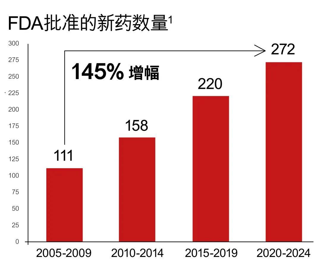 行业创新速度加快,以应对迫切医疗需求。在2020年至2024年期间共有272只药物获批准,较2005年至2009年五年期间增加145%1。健康护理行业持续在高未满足医疗需求领域取得突破,推动具备自主创新能力的企业实现内生增长。