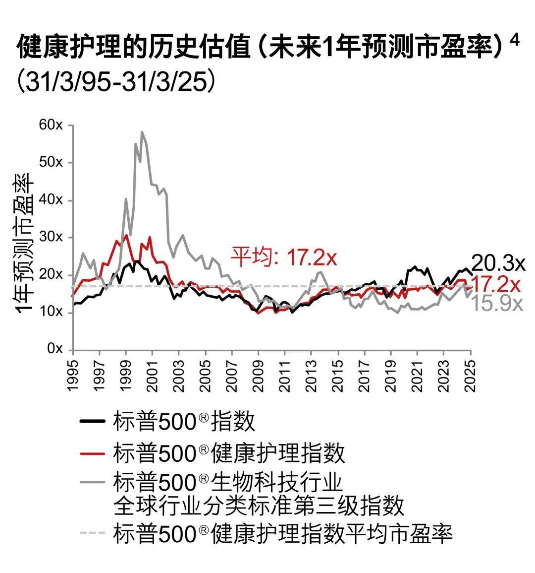 4.FactSet(美国金融数据公司),截至2025年3月31日。健康护理行业:标普500®健康护理指数;大市:标普500®指数;生物科技行业:标普500®生物科技行业全球行业分类标准第三级指数。
