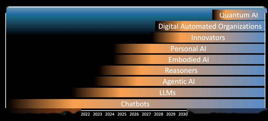 从简单文字反馈的聊天机器人,到大语言模型、代理式AI,再到推理型AI、具身智能、创新型AI,AI的演进呈现出“专家协作系统”的模式。