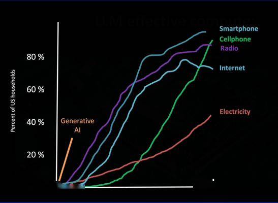 回顾人类历史上电力、互联网等关键技术的渗透曲线,AI的扩散速度史无前例:生成式AI(Generative AI)在2022年前后实现商业化突破,目前的渗透率已超过30%,是全球范围内普及最快的技术形态之一。