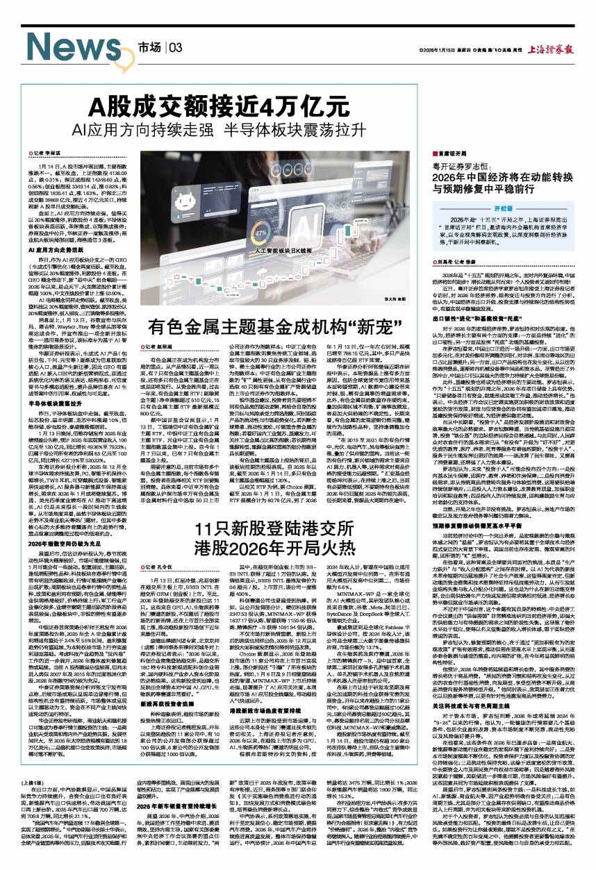 “在2019至2021年的有色行情中,光伏、电动汽车、风电等板块强势上涨,叠加了供应链的重构。当前这一轮的有色行情,新兴领域的需求主要来自AI算力、机器人等,这种需求对商品价格的接受能力远超预期。”汇安基金经理杨坤河表示,在持续上涨之后,当前有必要降低预期,不要期待有色板块在2026年仍旧复刻2025年的领先表现,但长期来看,资源品大周期尚在途中。返回搜狐,查看更多