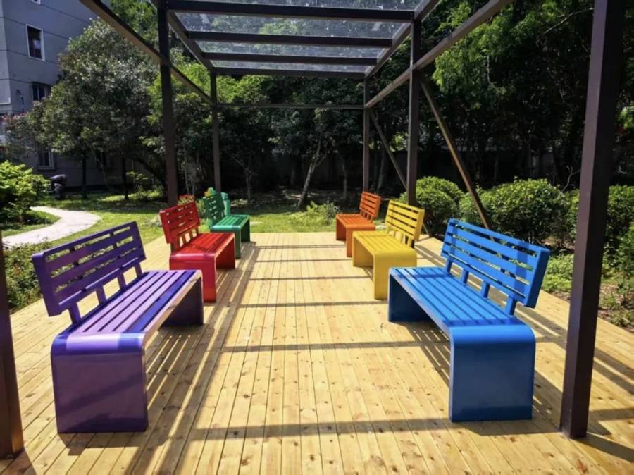 项目团队召开两场居民座谈会后,确定了改造方案,增设遮阳凉亭,并在凉亭内添置6 张彩虹休闲长椅,兼顾耐用性与舒适度。为了让环境更舒适,基金会同步启动“悦花园” 项目,在旁边开辟10平方米的小花坛,种植月季、绣球等易养护的花卉,搭配绿色灌木,打造 “凉亭+花园”的休闲组合。就这样,曾经黯淡的角落,成了居民喜爱的“休闲小天地”。
