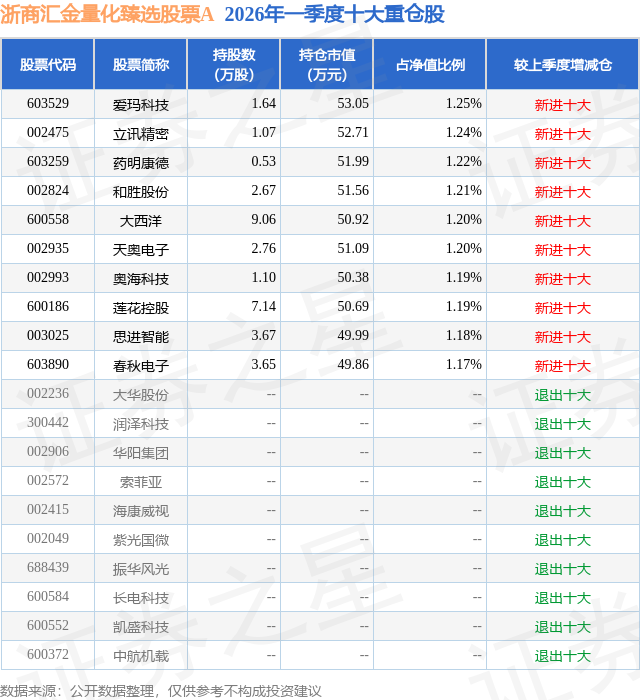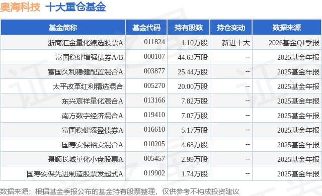 根据2026基金Q1季报公募基金重仓股数据,重仓该股的公募基金共1家,其中持有数量最多的公募基金为浙商证券资管的浙商汇金量化臻选股票A。浙商汇金量化臻选股票A目前规模为0.24亿元,最新净值1.2121(4月20日),较上一交易日上涨0.58%,近一年上涨28.82%。该公募基金现任基金经理为陈顾君。陈顾君在任的基金产品包括:浙商汇金中证A500指数A,管理时间为2025年5月28日至今,期间收益率为20.21%;浙商汇金新兴消费混合,管理时间为2025年8月11日至今,期间收益率为-8.77%;浙商汇金上证科创板综合指数A,管理时间为2025年8月19日至今,期间收益率为13.74%。