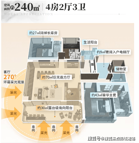 4. 建面约240㎡户型(2梯2户板楼,总层高17层,层高3.1米):该户型为全盘仅此一栋的T5栋楼王户型,独栋板楼设计,户户都是约240平千万级大平层,专梯专户,每个户型仅有28套,每一套都有专属名字,货量十分稀有,买少见少。该户型为四房两厅三卫,标配约9㎡奢阔入户电梯厅,彰显高端品质;南北纯板式独栋,每个户型都处于单边位置,户户有景,户户三面赏景,可直望白云山景和社区园林景观;客厅采用LDKG宽厅设计,空间宽敞大气,连接南向巨幕阳台,采光与视野极佳;主卧为南向套房,配备独立卫生间、衣帽间和270°飘窗,空间宽敞舒适,私密性强;双南向套房设计,满足大家庭居住需求;户型细节设计贴心,预留充足的储物空间,同时融入智慧家居系统,提升居住舒适度与便捷度。
